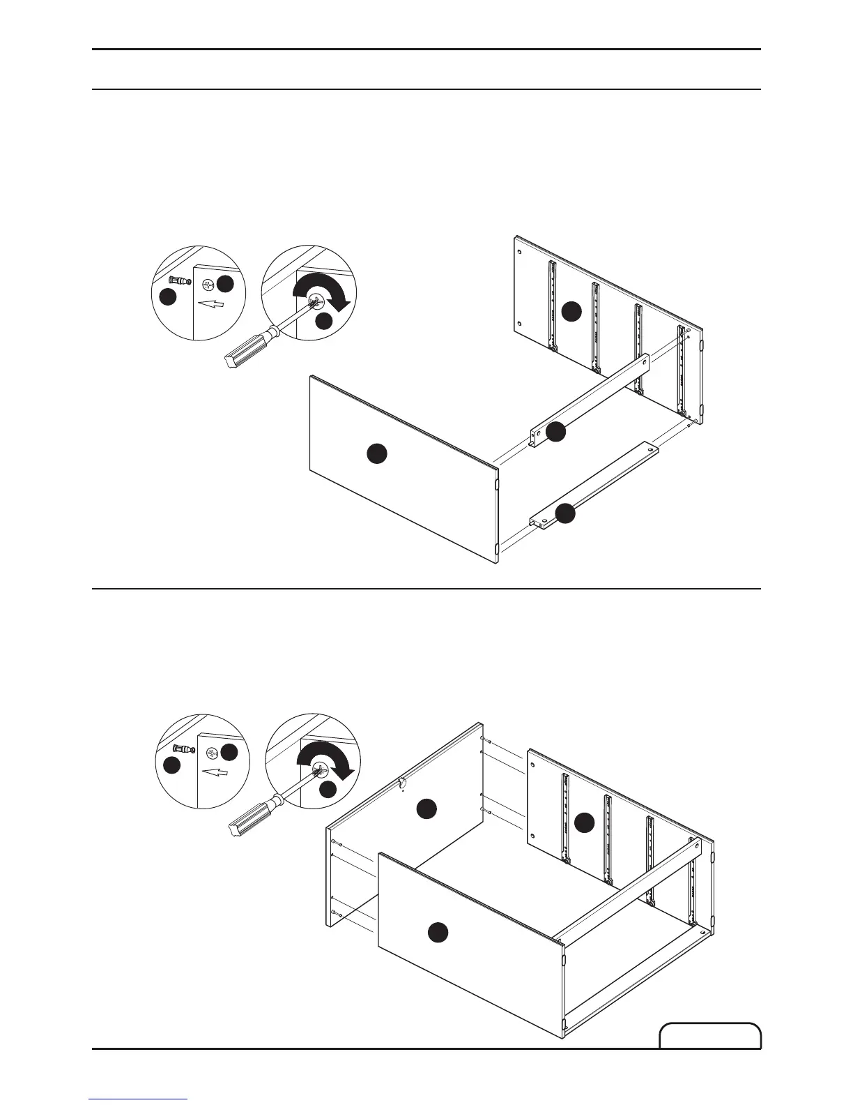 Secure top panel (1) to sides (2) (3) using a screwdriver to turn fitting (B) clockwise to fix.