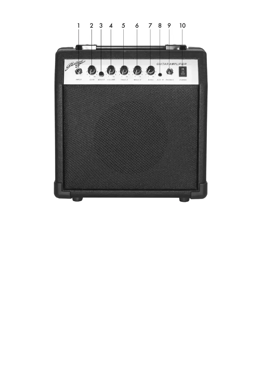 1. Instrument input: Connect a guitar with the provided guitar cable.