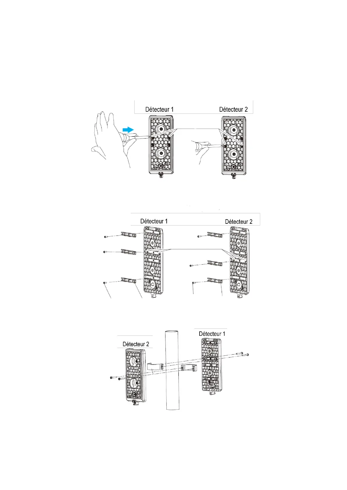 À l’aide des vis M3x8 fournies, fixez trois supports de montage au châssis de chaque détecteur.