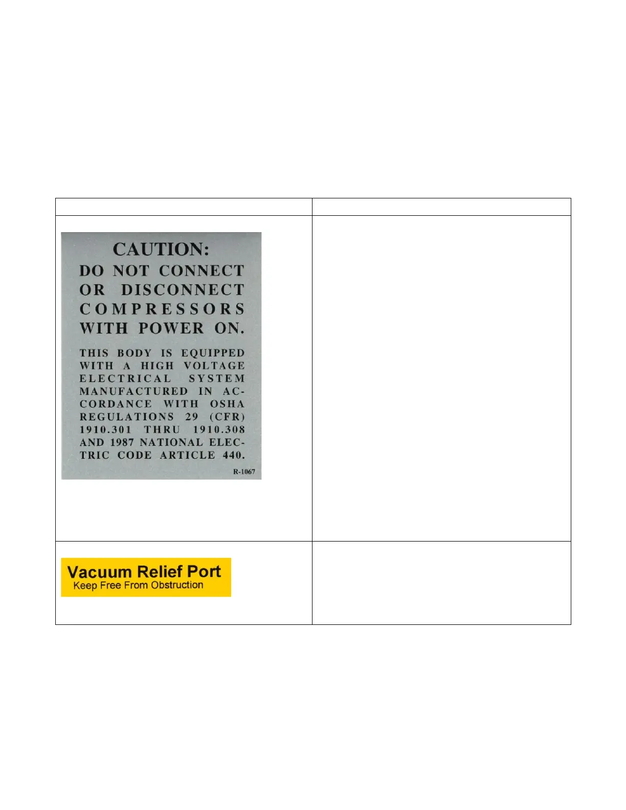 Table 1: Refrigeration System safety labels and locations