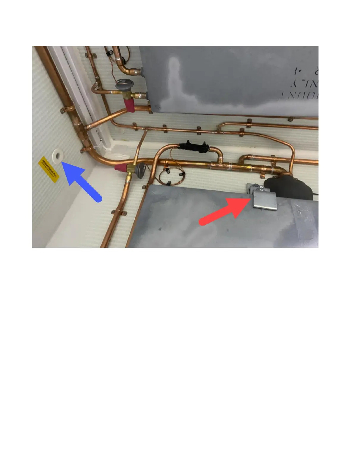 Figure 8: Example of refrigerant piping in good condition. Red arrow points to a plate bracket. Blue