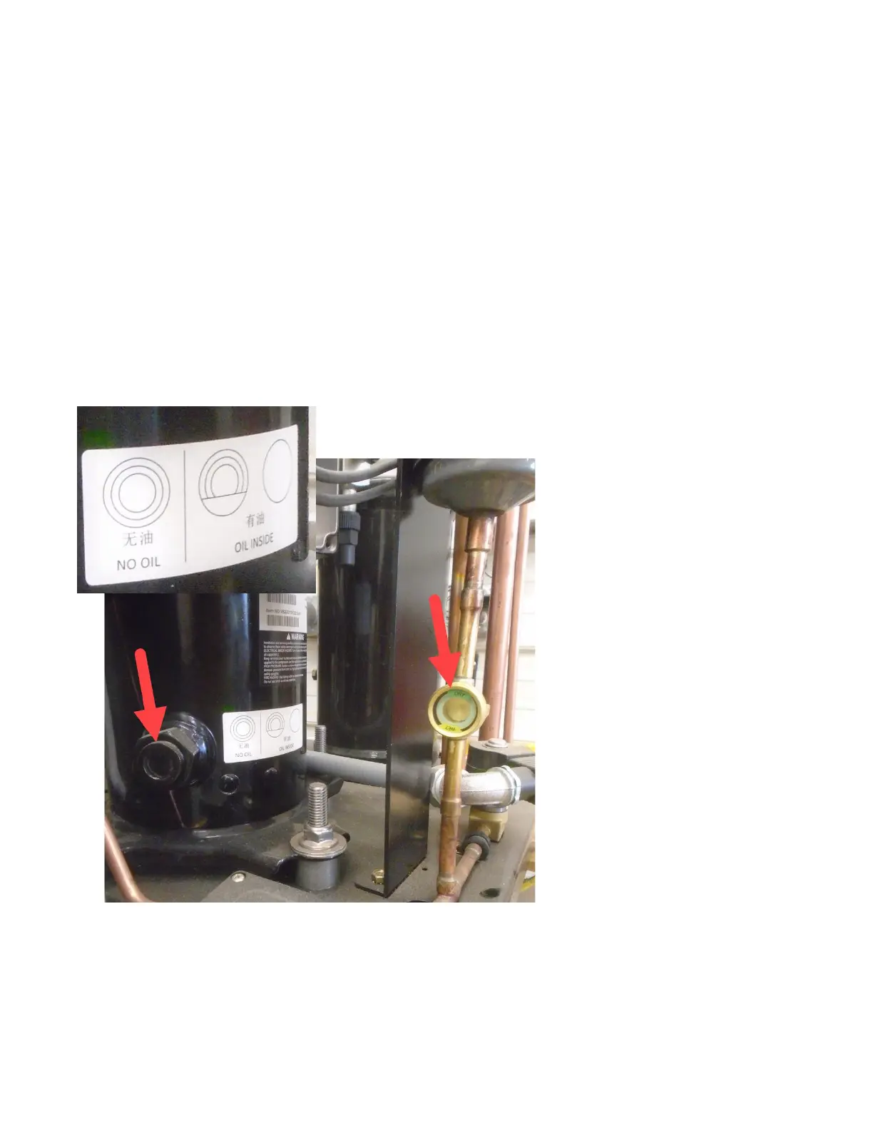 • View oil level sight glass on Compressor. Sight glass should be 1/3 to 1/2 full.