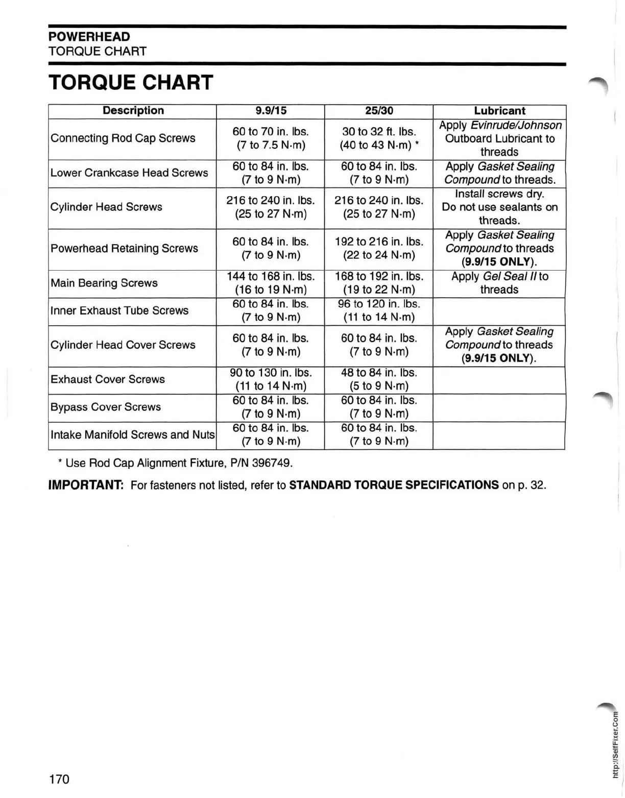 IMPORTANT: For fasteners not listed, refer to STANDARD TORQUE SPECIFICATIONS on