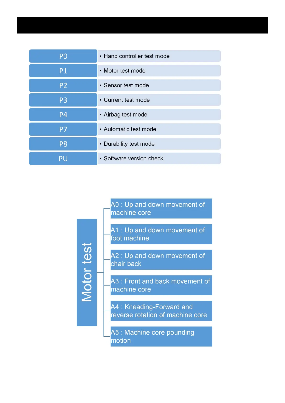 Motor test mode is mainly used to test if each motor works normally and to adjust chair angle