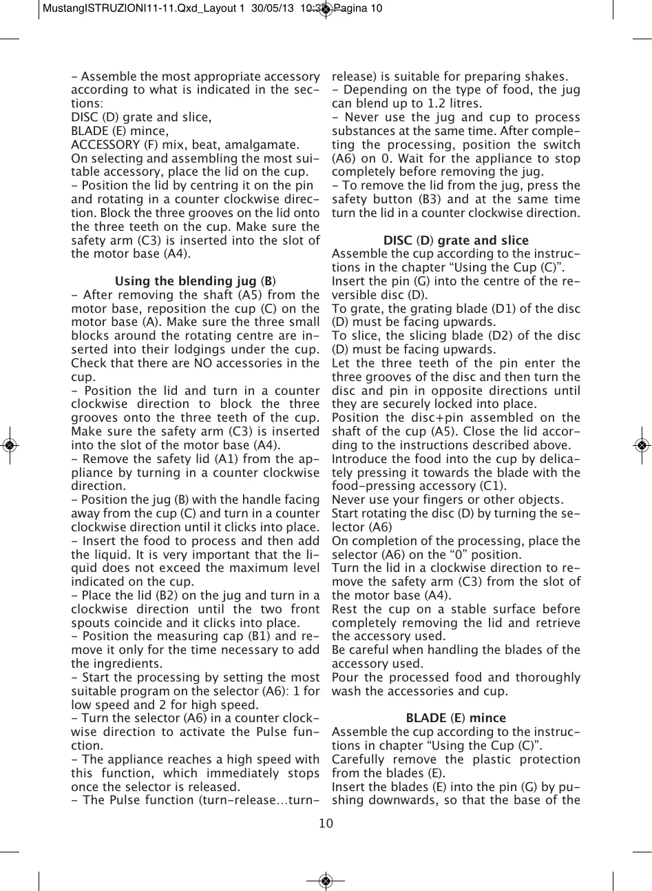 Insert the blades (E) into the pin (G) by pu-