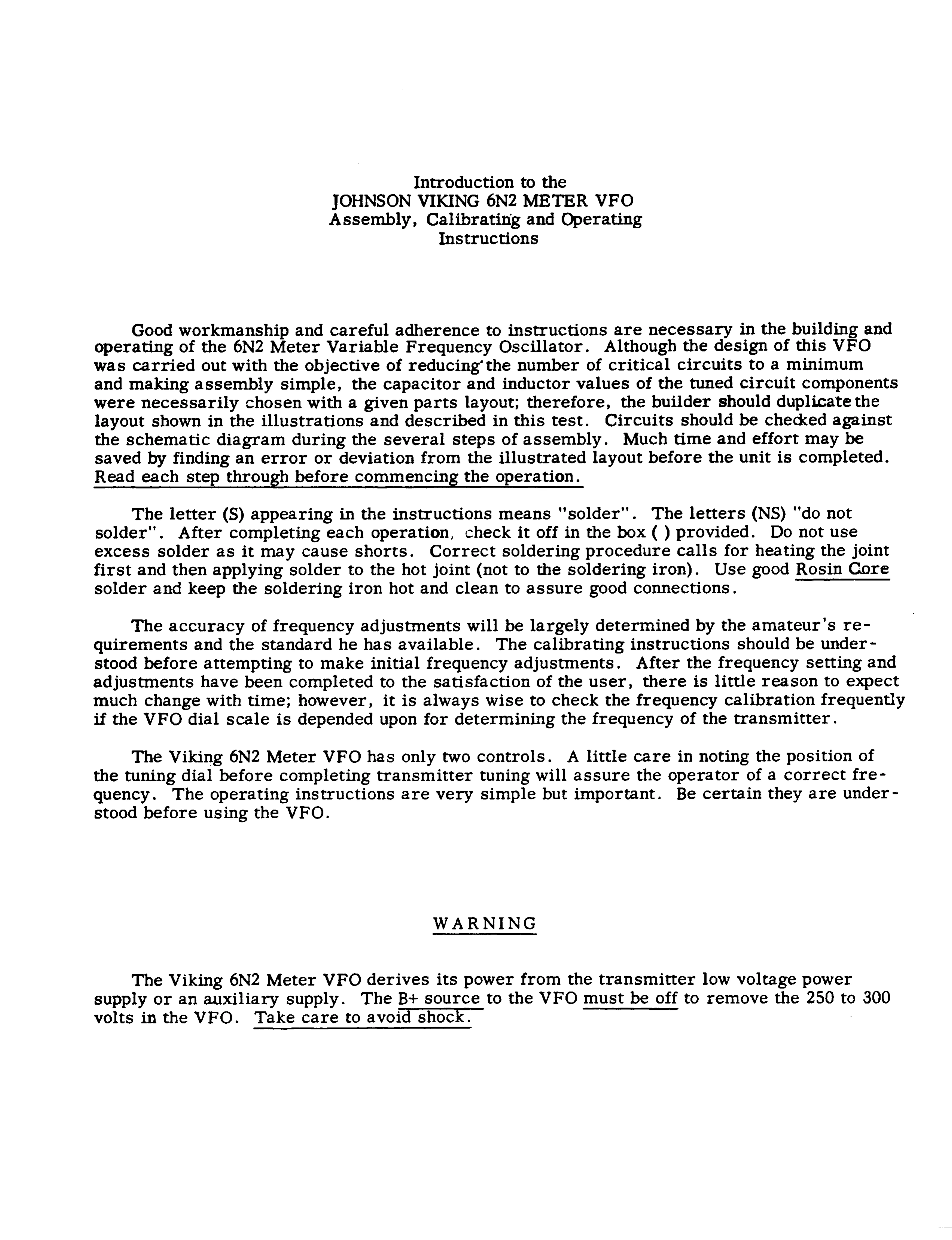 Johnson VIKING 6N2 - Introduction to VFO Operation; VFO Assembly and Operation Overview; Safety Warning; High Voltage Shock Hazard