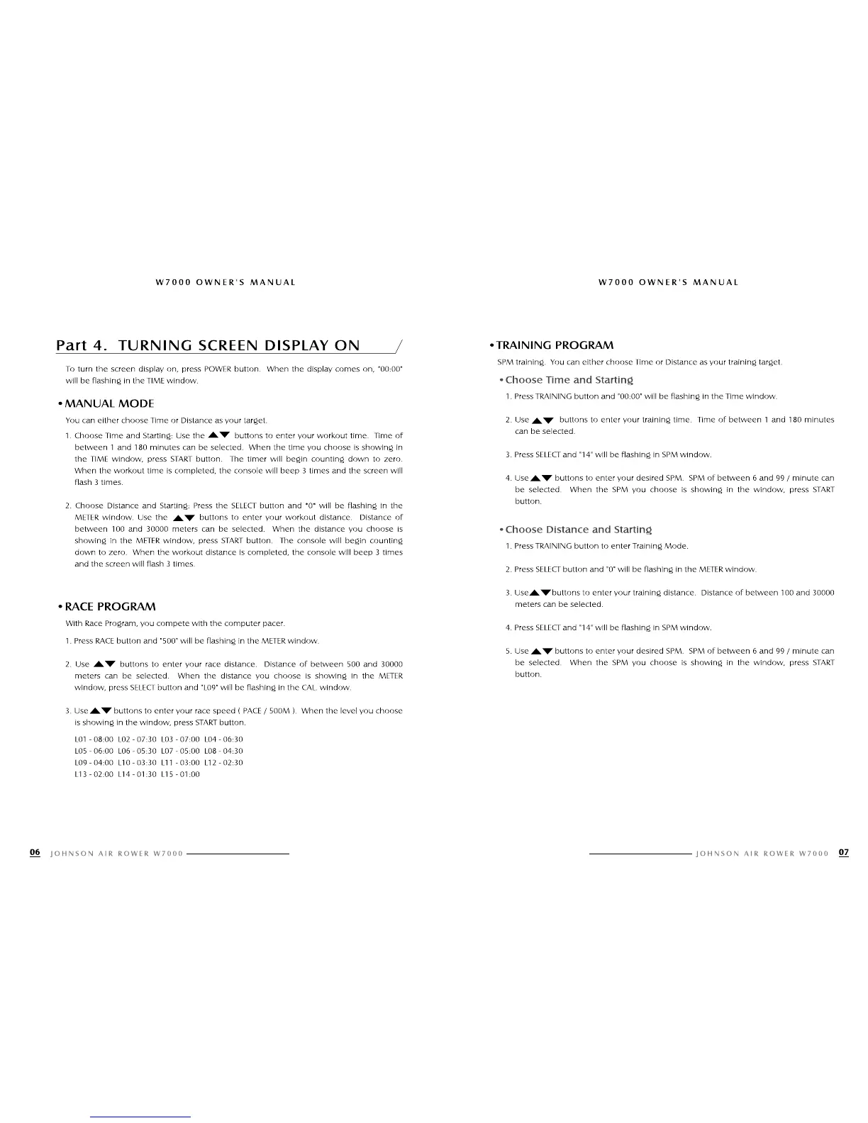 Johnson W7000 - Turning Screen Display on; Manual Mode; Race Program; Training Program