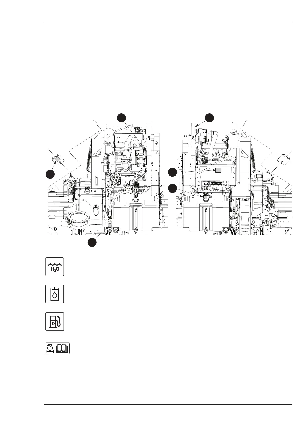 Graphical symbols are used to indicate the water, fuel and hydraulic oil tank filler ports and air