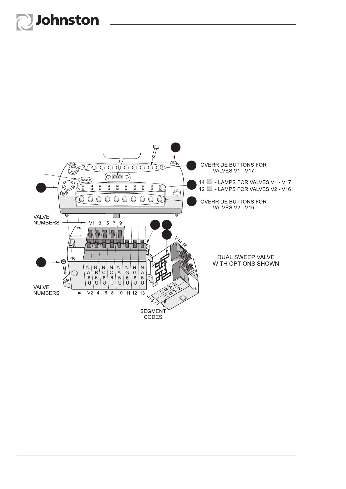 LED that illuminates when energised (A) and a manual override button (B) for ports 2 or 4 on each segment