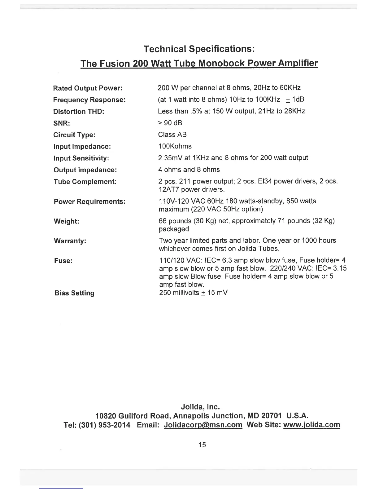 Jolida Fusion - Technical Specifications; Rated Output Power; Frequency Response; Distortion THD