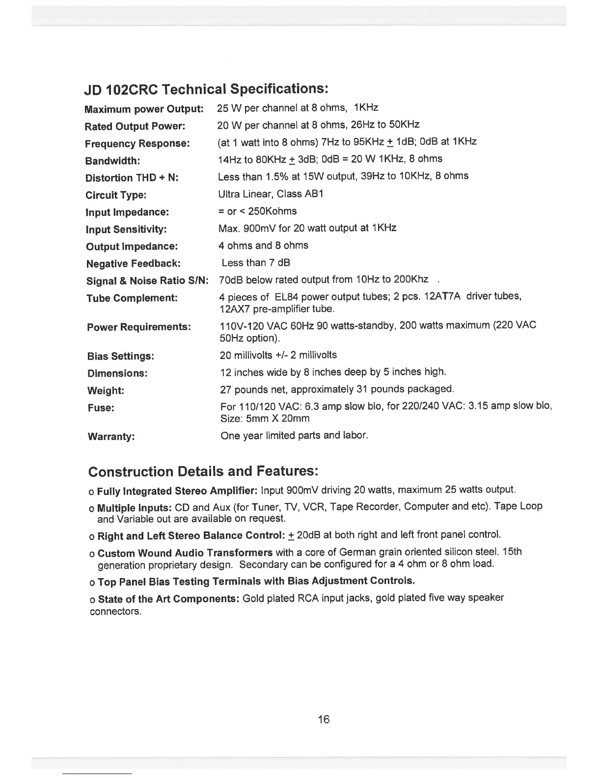 Jolida JD 102CRC - Technical Specifications; Construction Details and Features