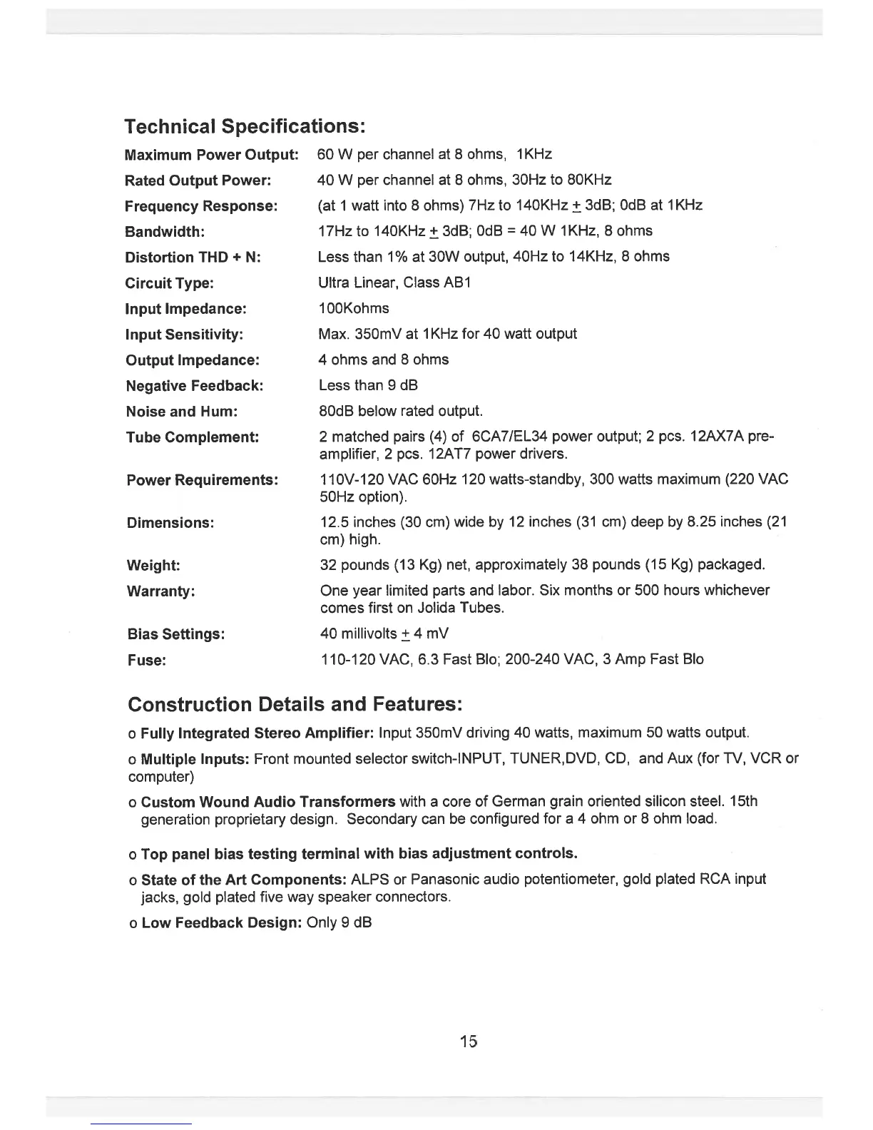 Jolida JD 202BRC - Technical Specifications; Performance Specifications; Construction Details and Features
