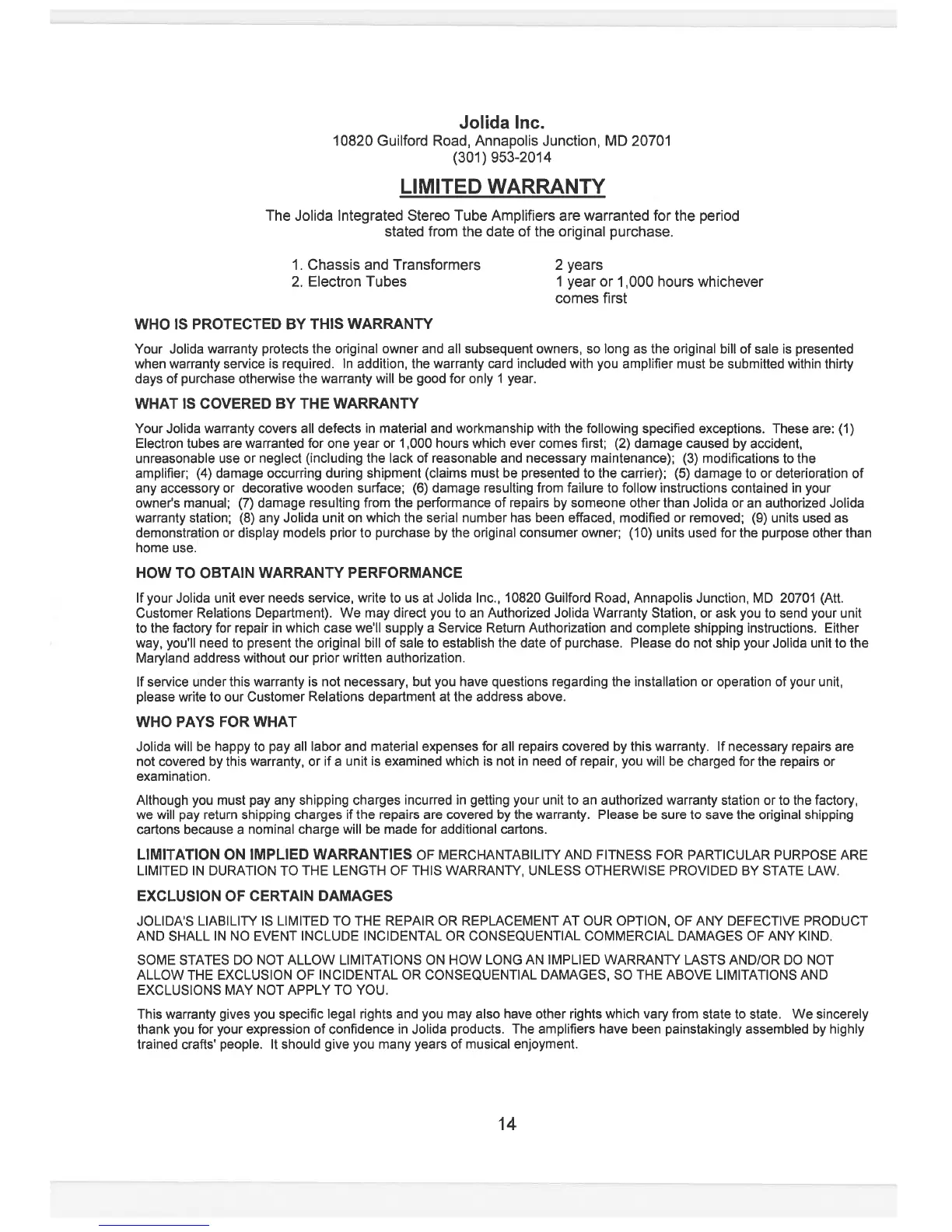 Jolida JD 302CRC - Limited Warranty; Warranty Coverage and Claims