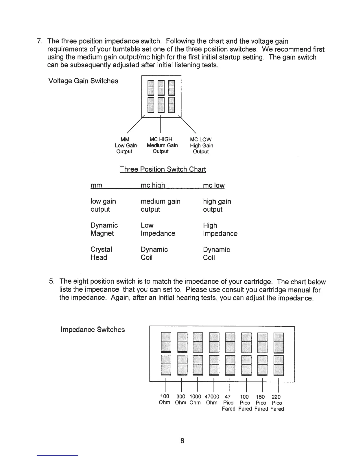 Jolida JD 9 - Voltage Gain Switches; Impedance Switches; Three Position Switch Chart