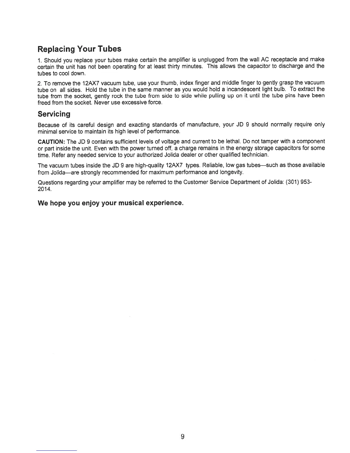 Jolida JD 9 - Replacing Vacuum Tubes; Tube Replacement Procedure; Servicing and Safety Warnings; Servicing Precautions