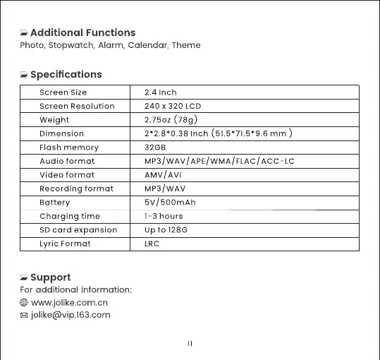 JOLIKE M4 - Additional Features and Support; Extended Functions Overview; Technical Specifications; Customer Support Information