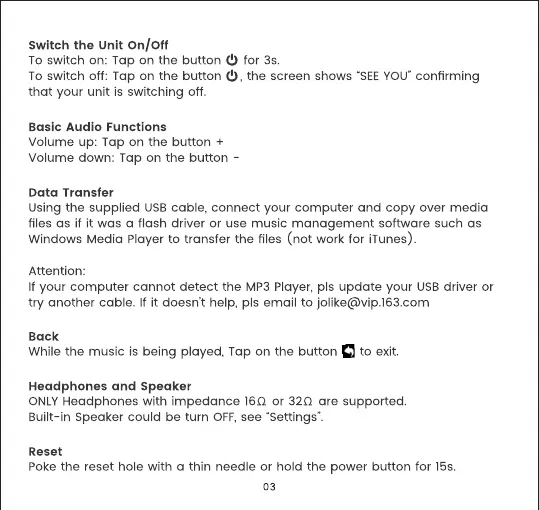 JOLIKE M4 - Device Operation; Powering On and Off; Basic Audio Control; Data Transfer