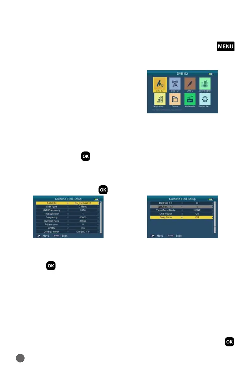 Select DVB-S2, then press OK into the Satellite Find Setup.