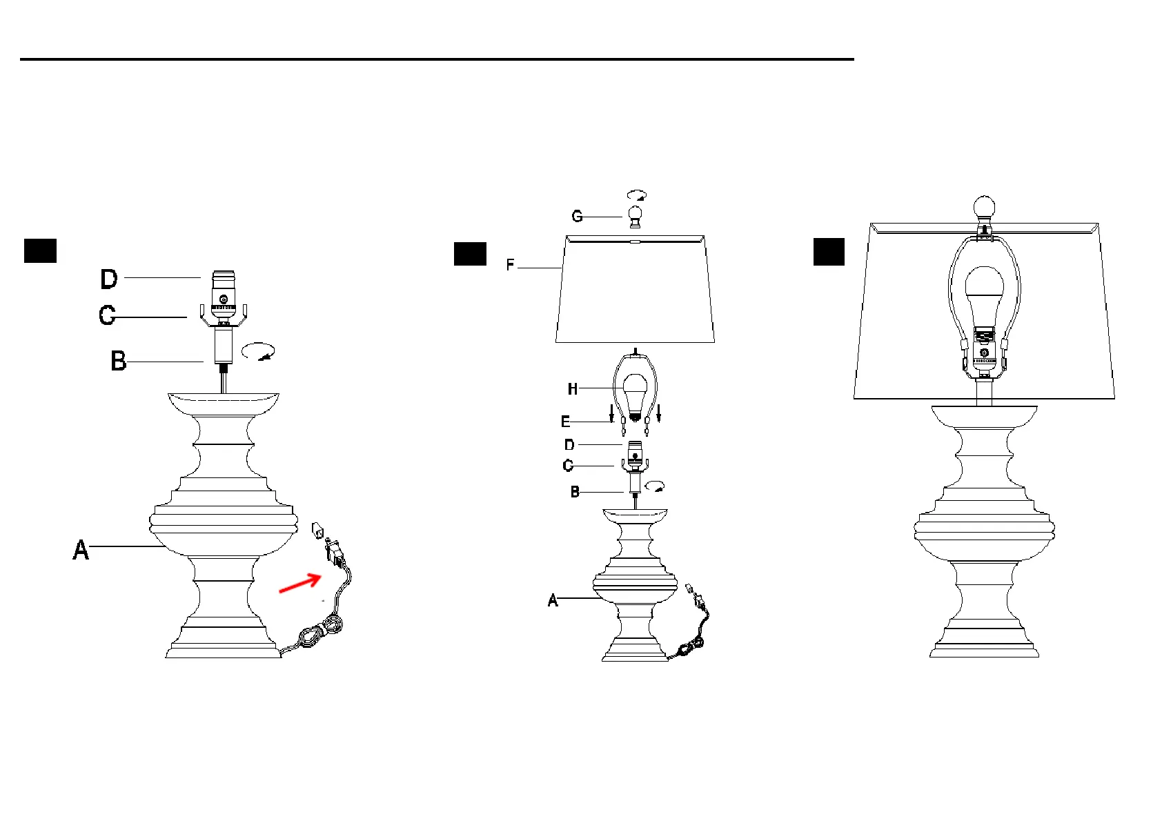 Screw the Neck (B) onto the Lamp base (A) Put the shade(F) on the Harp(E),then if everything is stable.