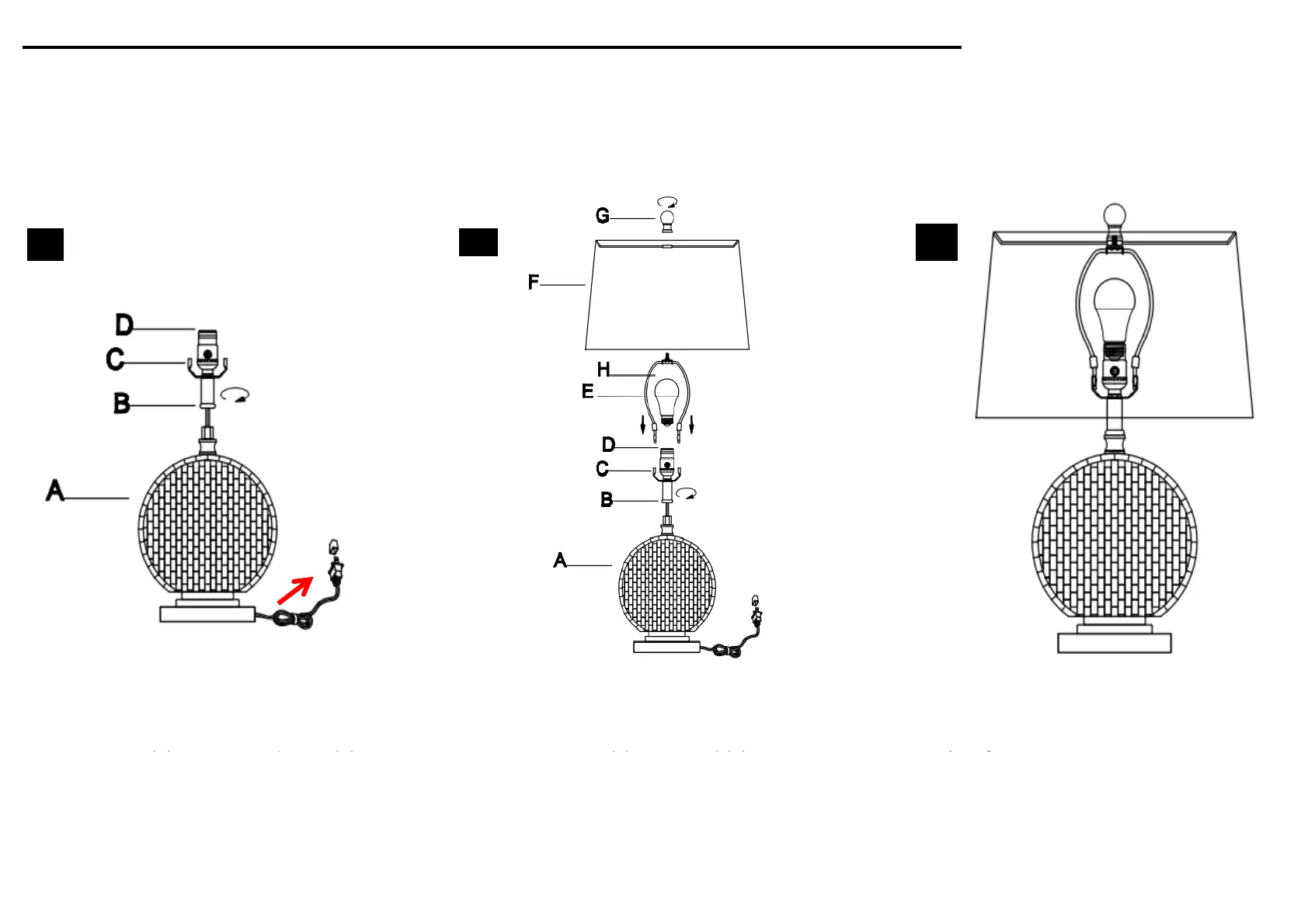 Screw the Neck (B) onto the Lamp base (A) Put the shade(F) on the Harp(E), then if everything is stable.