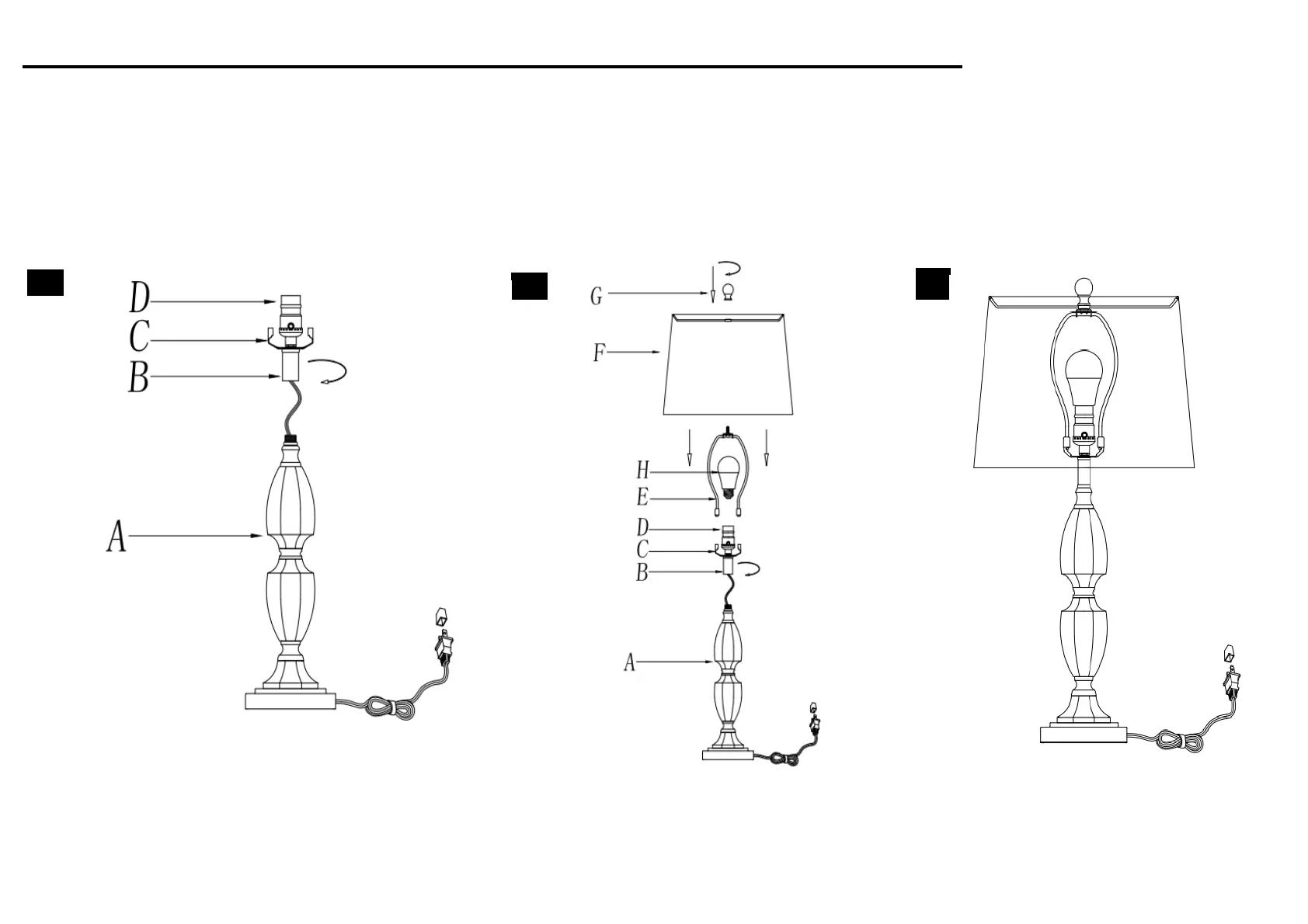 Screw the Neck (B) onto the Lamp base (A) Put the shade(F) on the Harp(E),then if everything is stable.