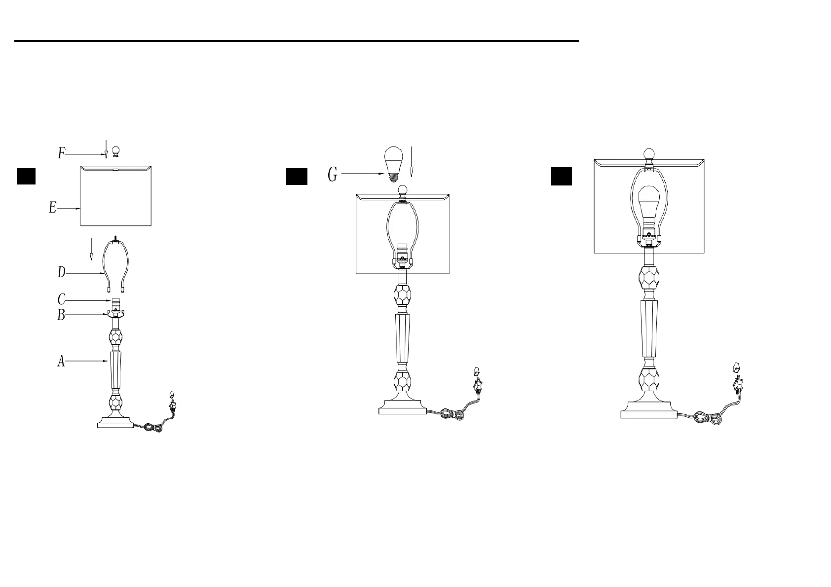 Insert the Harp (D) into the Saddle (B). Insert the bulb(G) into the socket(C). Put the light on a level surface to check