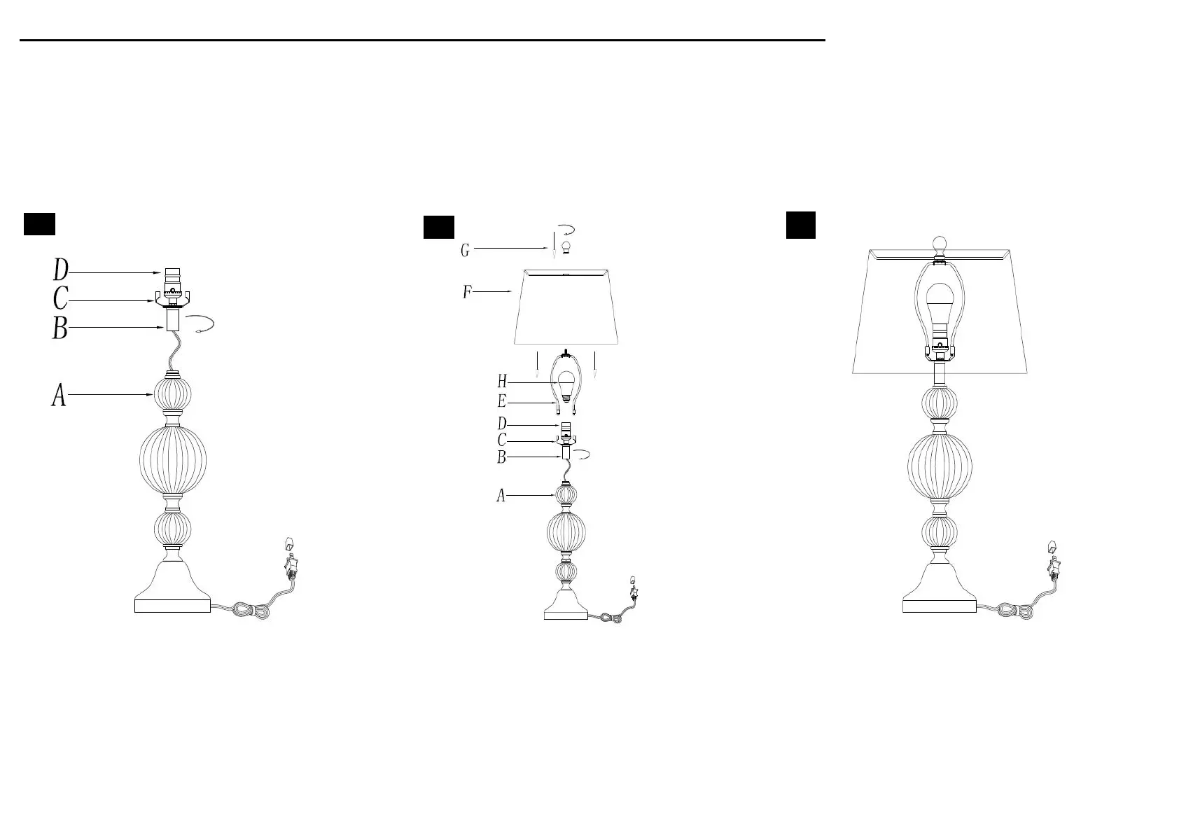 Screw the Neck (B) onto the Lamp base (A) Put the shade(F) on the Harp(E),then if everything is stable.