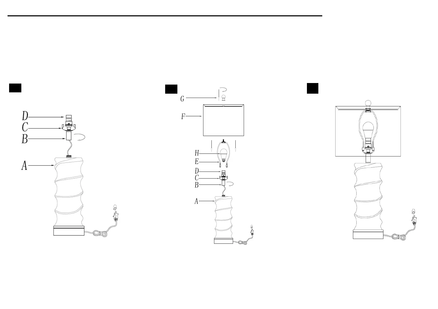Screw the Neck (B) onto the Lamp base (A) Put the shade(F) on the Harp(E),then if everything is stable.