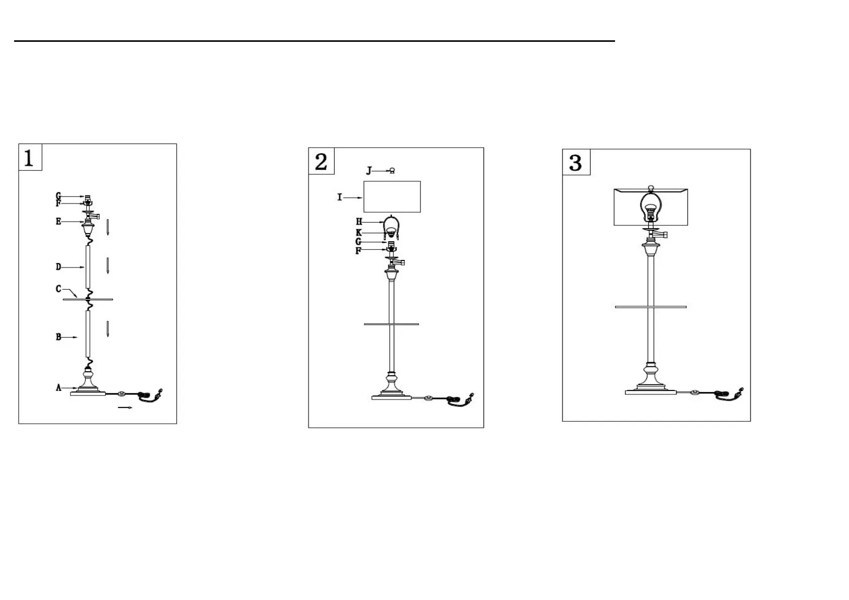 Screw the Lamp body (E) onto the Tube(D) tighten the Finial (J) into the Harp (H)