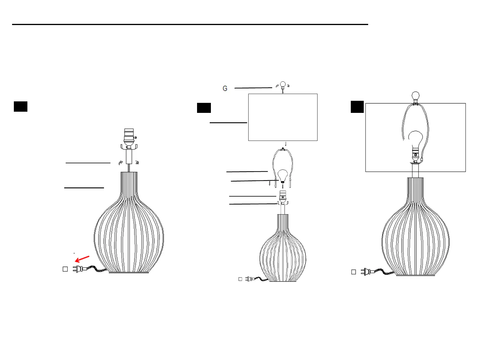 Screw the Neck (B) onto the Lamp base (A) Put the shade(F) on the Harp(E), then if everything is stable.