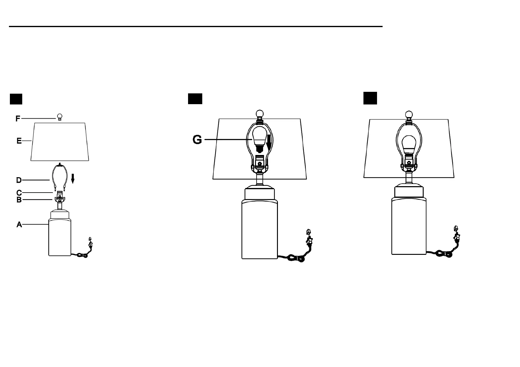 Insert the Harp (D) into the Saddle (B). Insert the bulb(G) into the socket(C). Put the light on a level surface to check