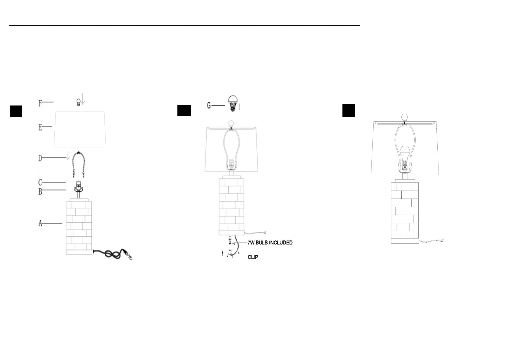 Put the shade(E) on the Harp(D), then Replace with 7W bulb(bulb included) if everything is stable.