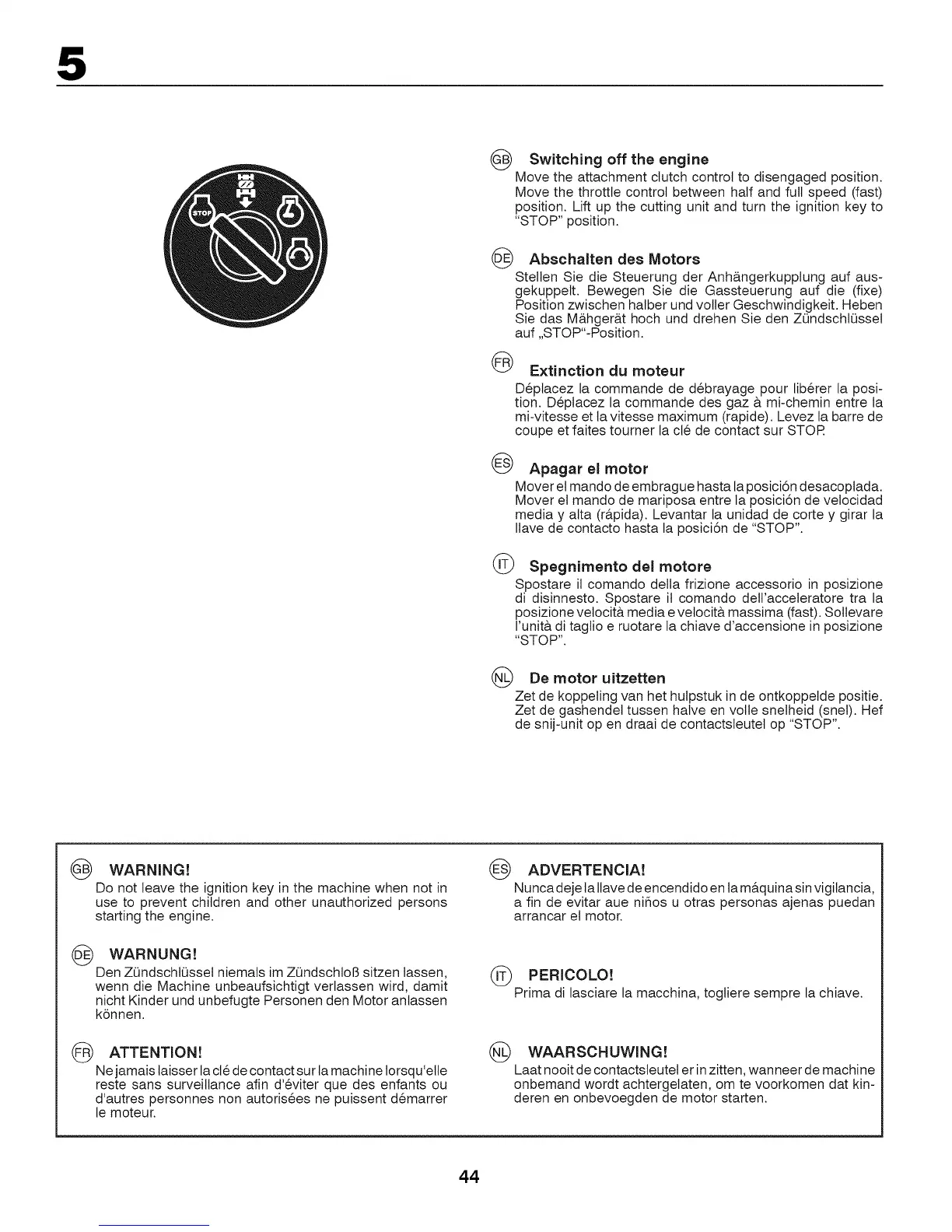 position. Lift up the cutting unit and turn the ignition key to