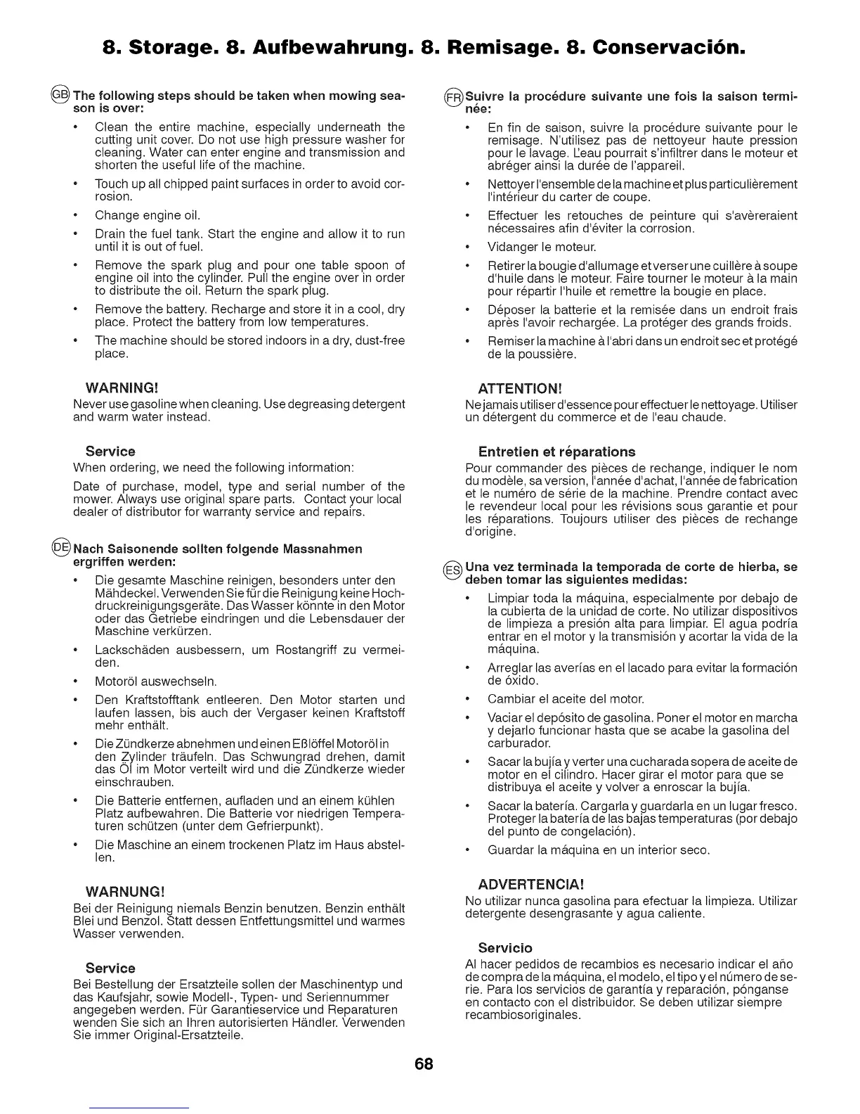 8. Storage. 8. Aufbewahrung. 8. Remisage. 8. Conservaci6n.