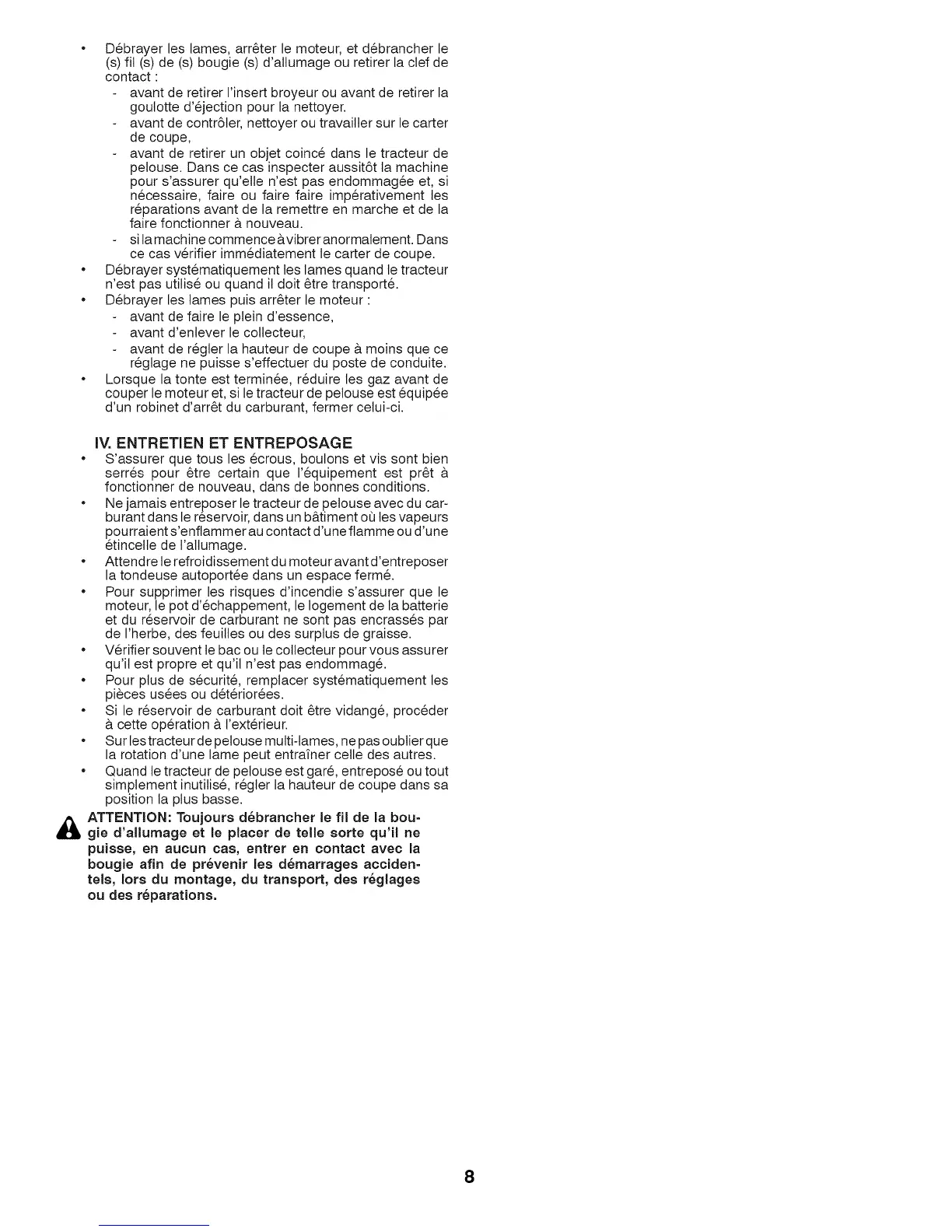 • Quand le tracteur de pelouse est gate, entrepose ou tout