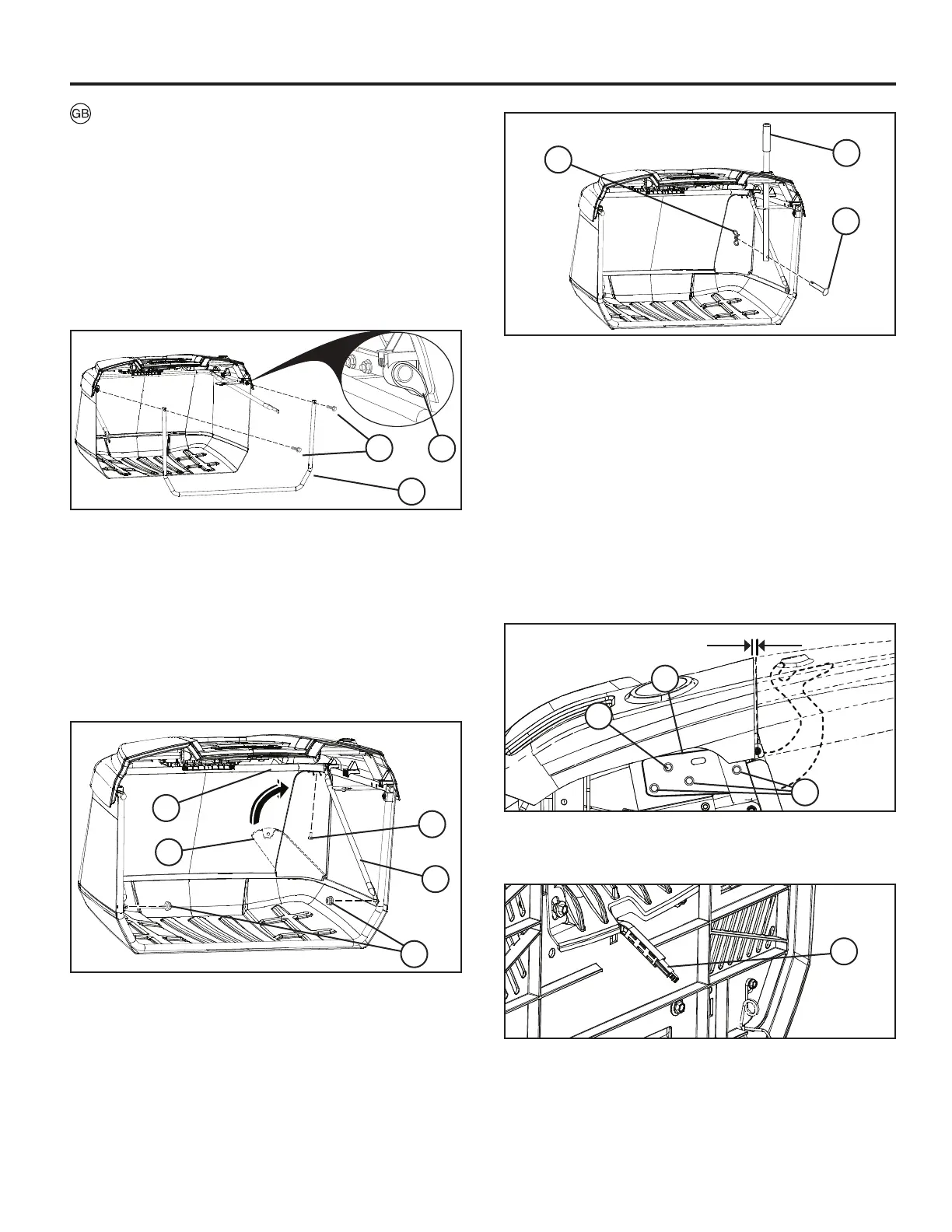 • Uninstall (1/4”-20) lock nuts (4) at bottom of front bagger frame.