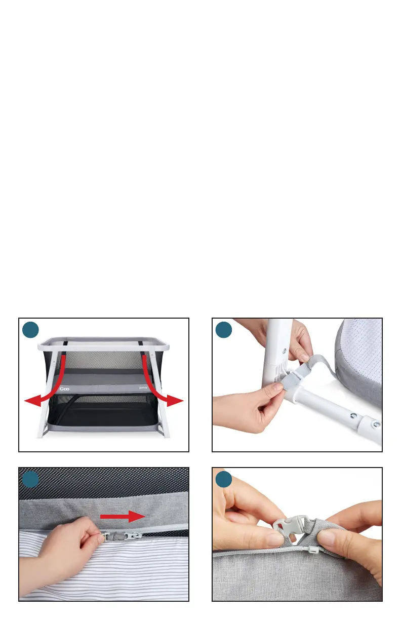 • Thread the buckle on the zipper through the fabric loop on the mattress and secure. (4)