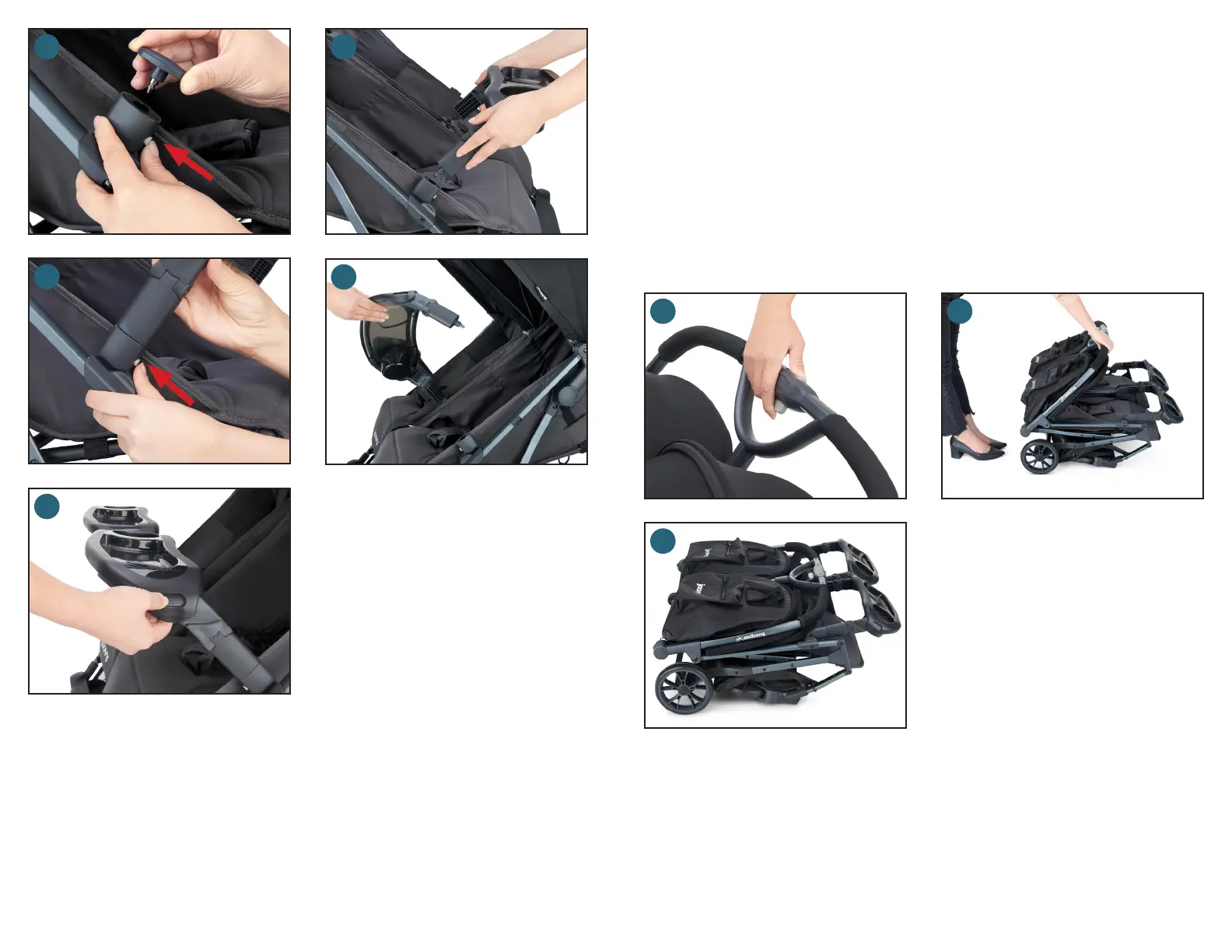 • 손잡이를 앞으로 밀어내고 천천히 뒷바퀴 쪽으로 이동시키세요. (24) 유모차가 자동으로 고정됩니다. (25)