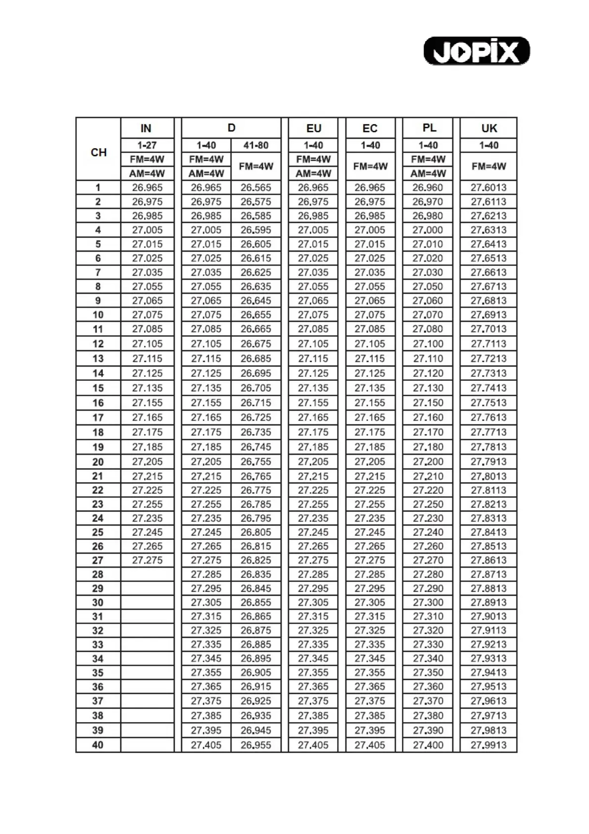 JOPIX AN-2 - Channels and Frequencies Table