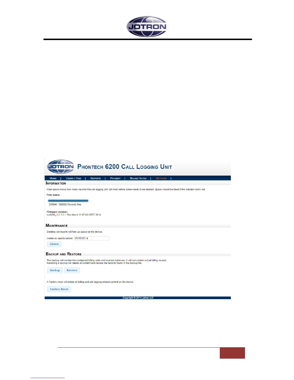In the ‘Settings’ page you can get an overview of the system as well as perform backup and