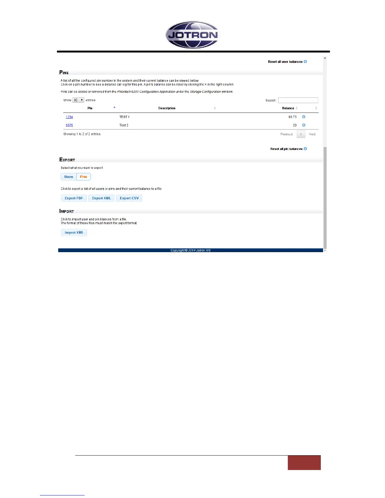 “Export XML” button. Note that this will change the balances of all the users and pins that are