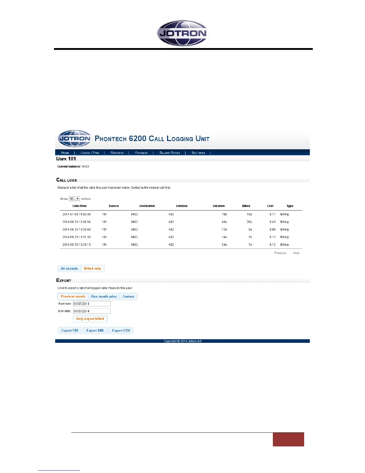 The detailed user page displays the detailed call logs for a given user. The current balance of the user