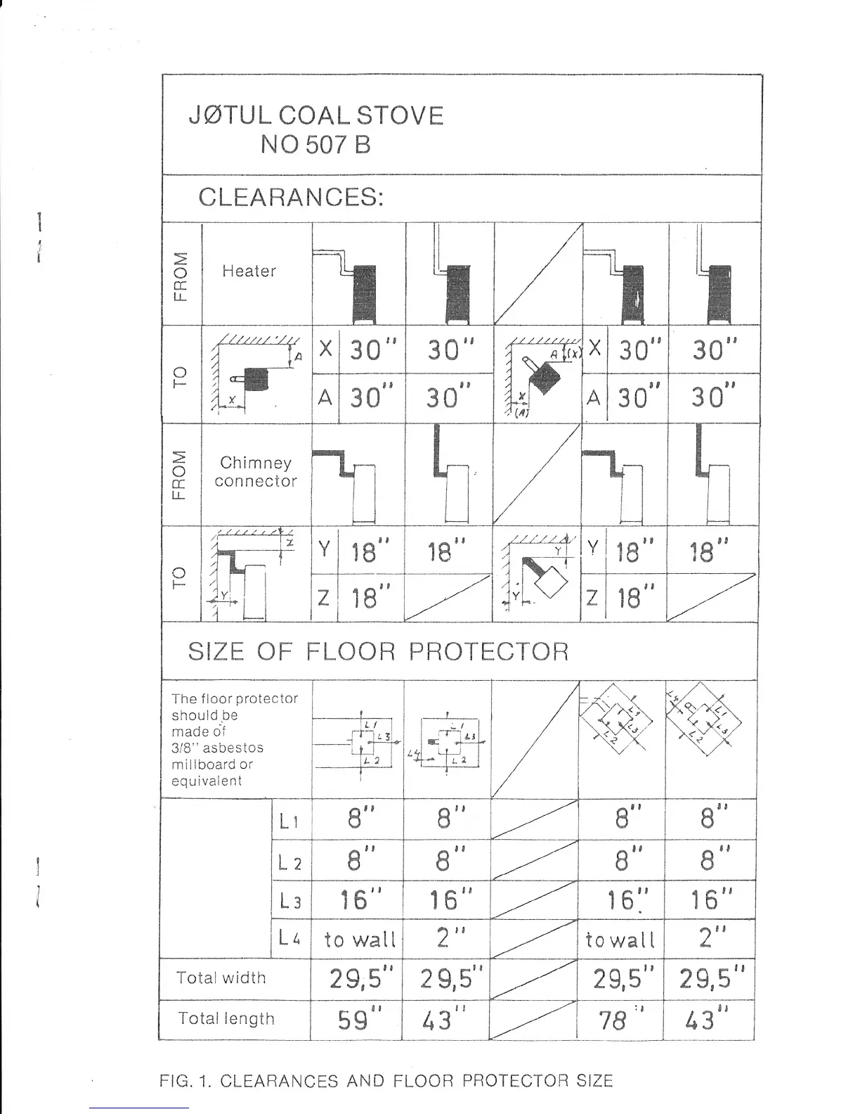 Jøtul 507 B - Clearances; Size of Floor Protector