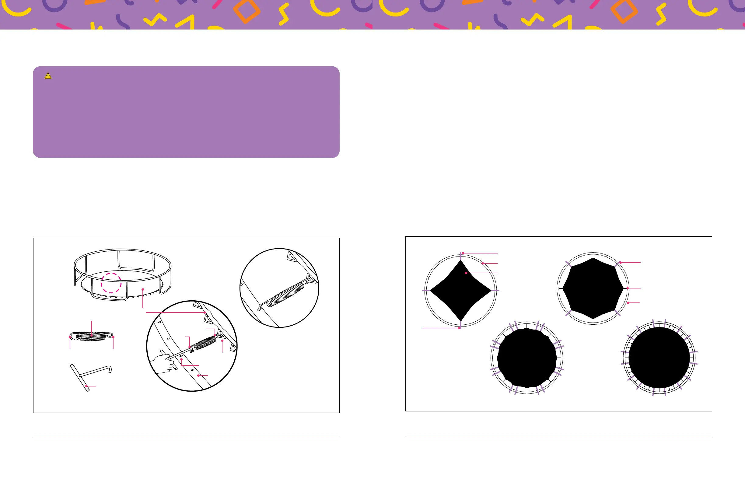 • Do not use your leg to push on the trampoline frame or legs when installing the springs as this will cause