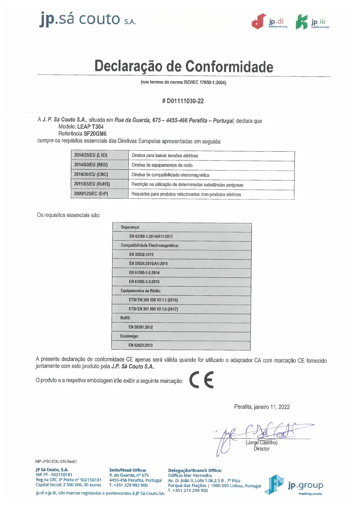 A J. P. Sá Couto S.A., situada em Rua da Guarda, 675 - 4455-466 Perafita - Portugal, declara que