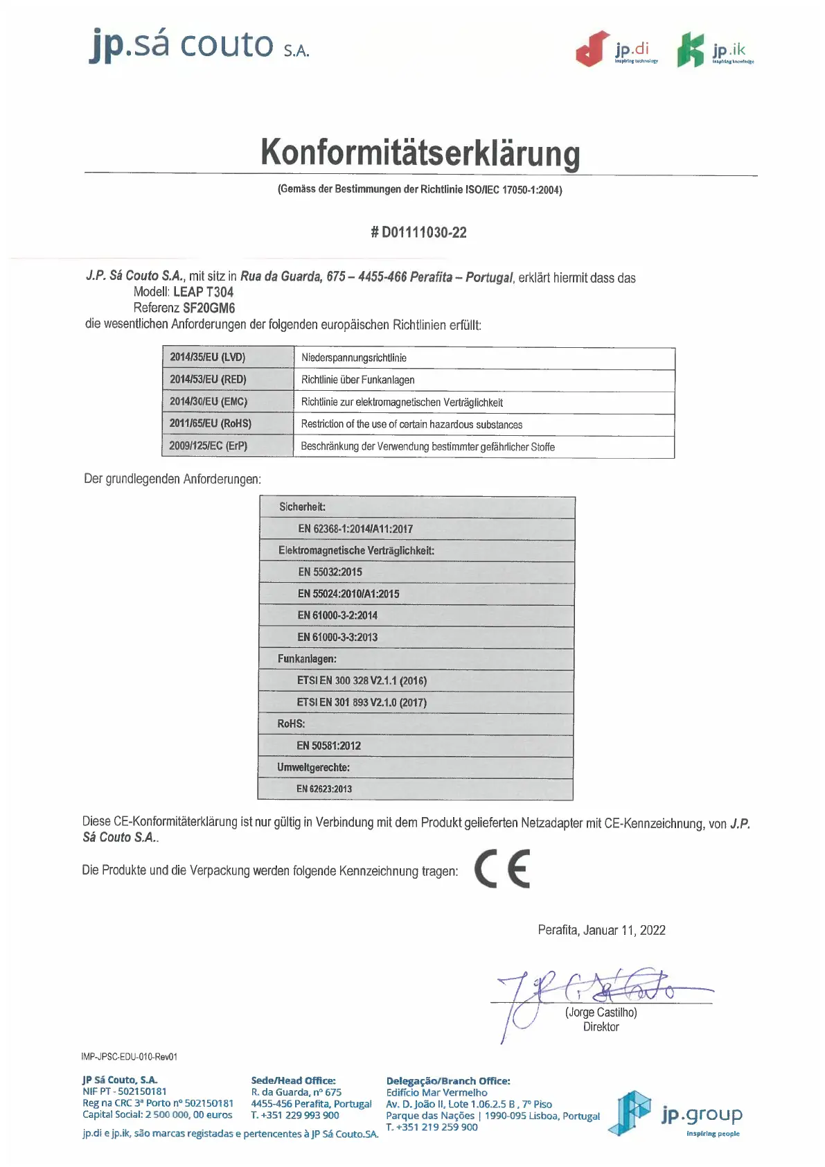 Diese CE-Konformitàterklãrung ist nurgültig in Verbindung mit dem Produkt gelieferten Netzadapter mit CE-Kennzeichnung, von J.P.