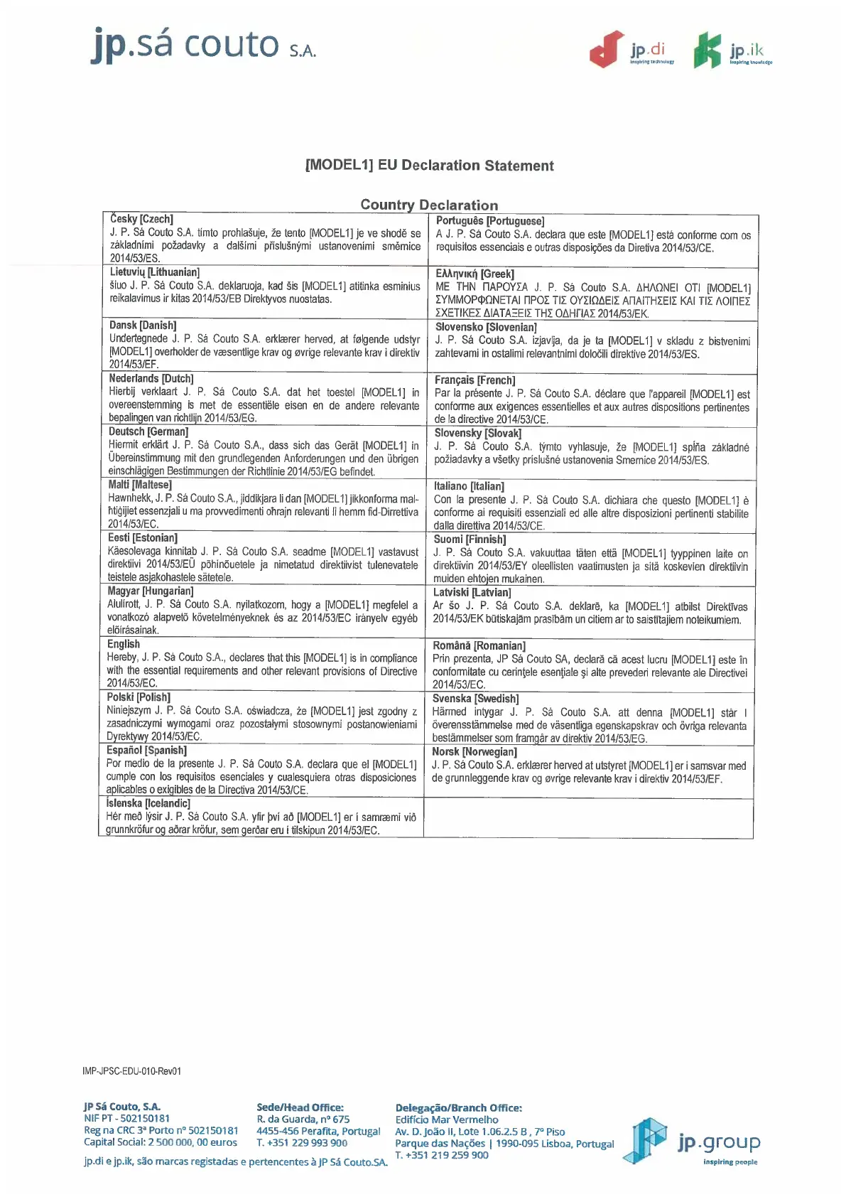 Hereby, J. P. Sá Couto S.A., declares that this [MODELl] is in compliance