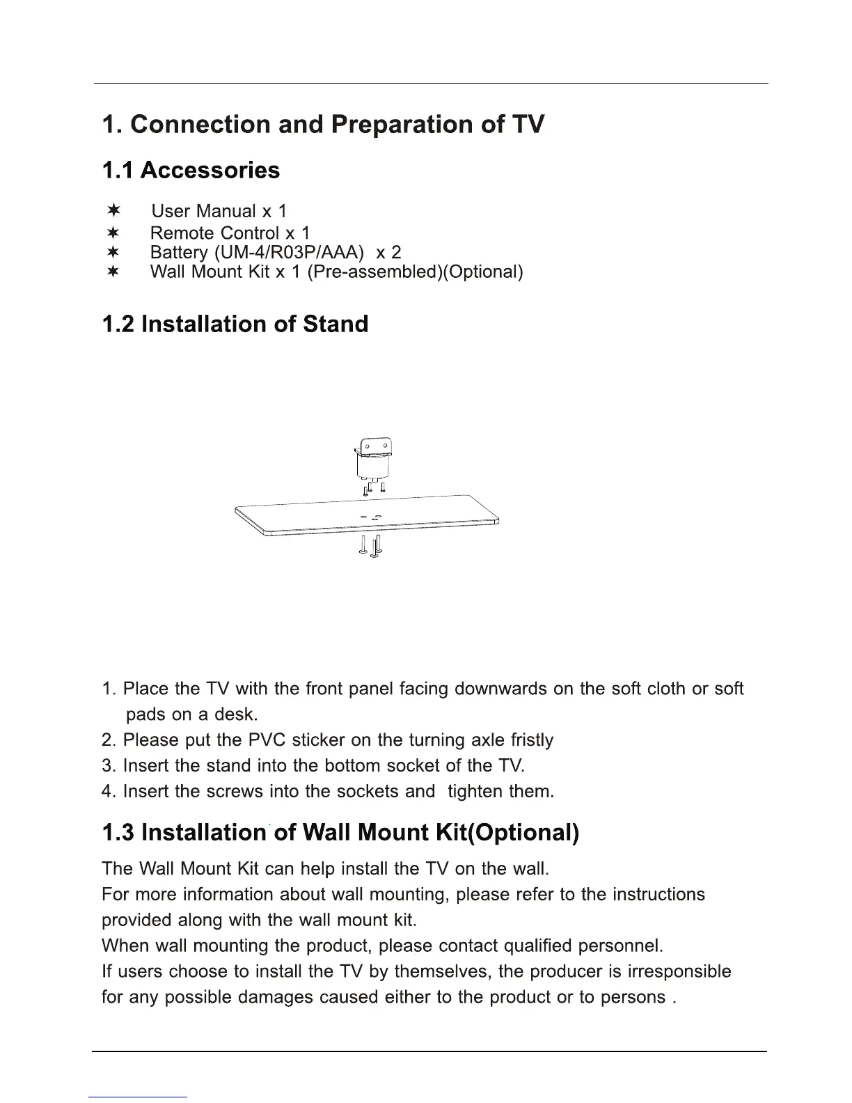 JPE E32D7212 - 1. TV Connection and Preparation; 1.1 Accessories and Installation