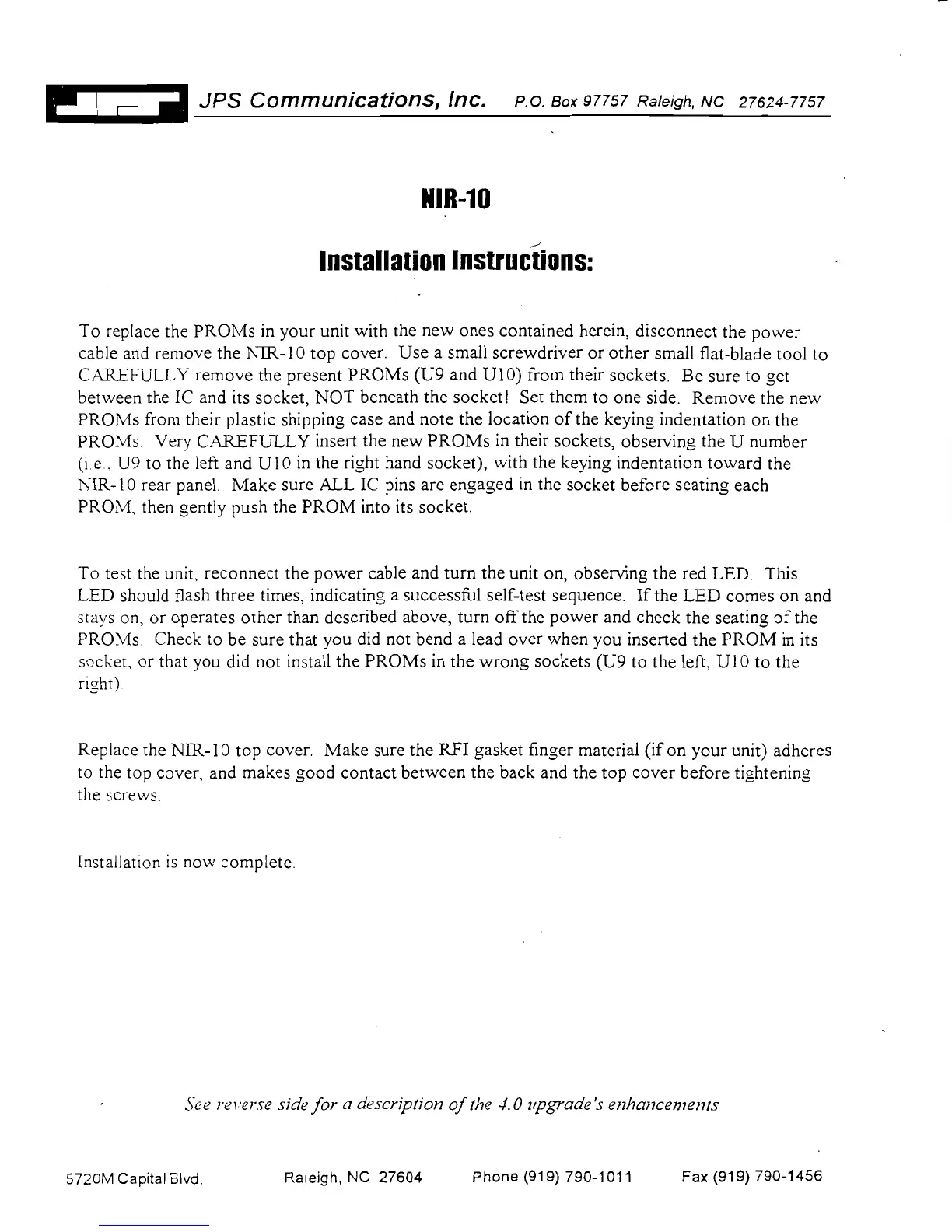 JPS Communications NIR-10 - NIR-10 - Installation Instructions