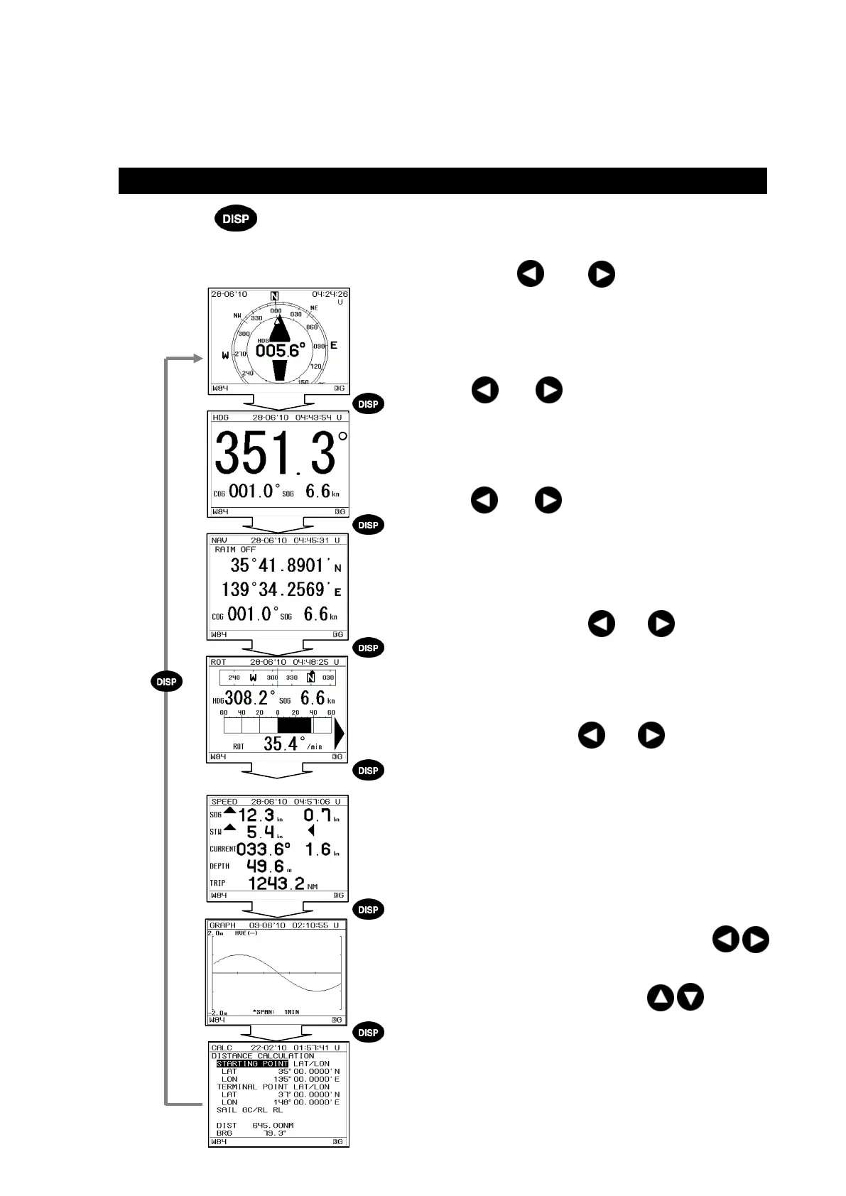 Pressing the key rotates screens. The unit displays the compass screen immediately